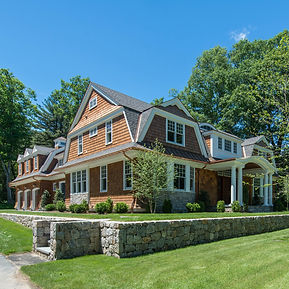 Five-bedroom traditional gambrel home nestled in a quiet rural setting. The shape of the property is long and deep and the design of the home took advantage of the natural topography to create a secluded entertaining courtyard. The exterior of the home feature natural red cedar shingles with stone accents.